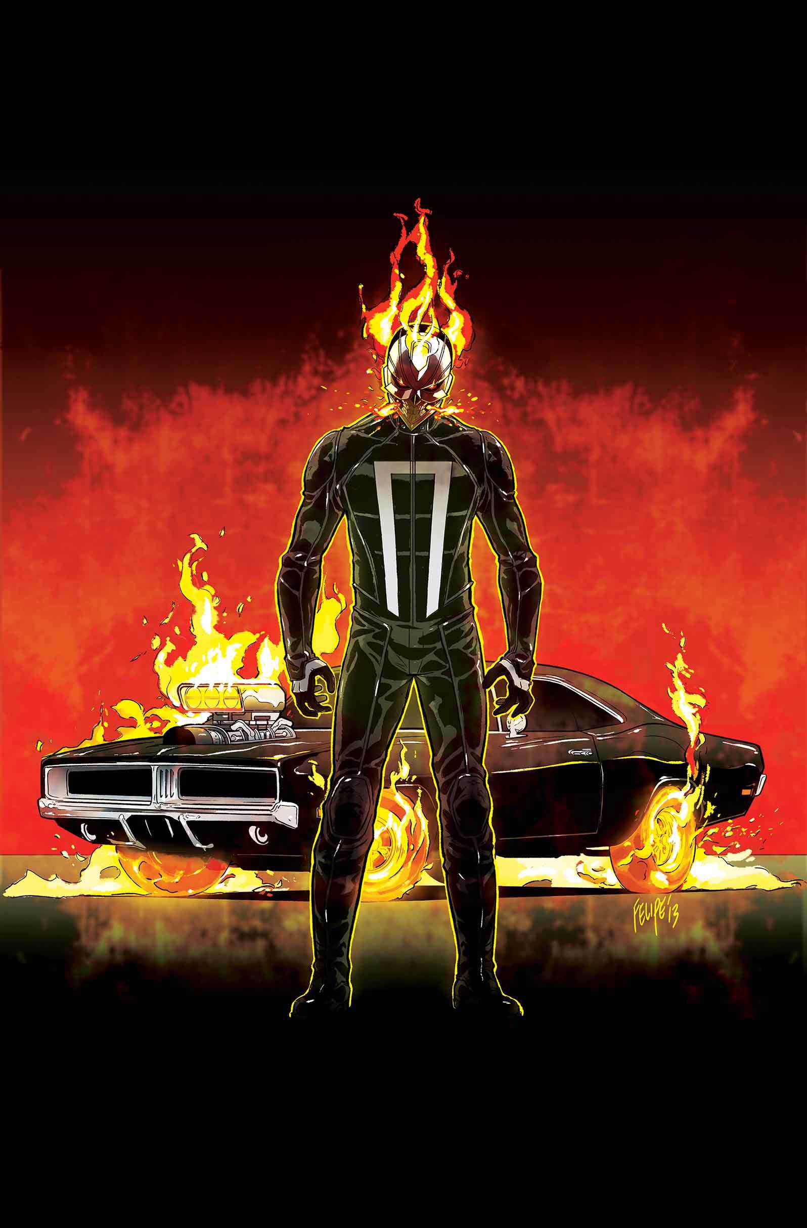 Aucun changement à constater au niveau du costume qui est le même que celui de la version humaine. Par contre, la tête amène quelques changements par rapport à la version cinéma avec Nicolas Cage très proche de la version classique en comic. En fait, c’est un mix entre la version classique et l’All New Ghost Rider (regardez la couverture du numéro 4 ci-dessous, on retrouve exactement la même pose que ce soit pour le démon ou sa voiture). On a une double ligne qui part à la moitié des yeux. Une énorme mâchoire avec deux trous béants à l’emplacement des joues.