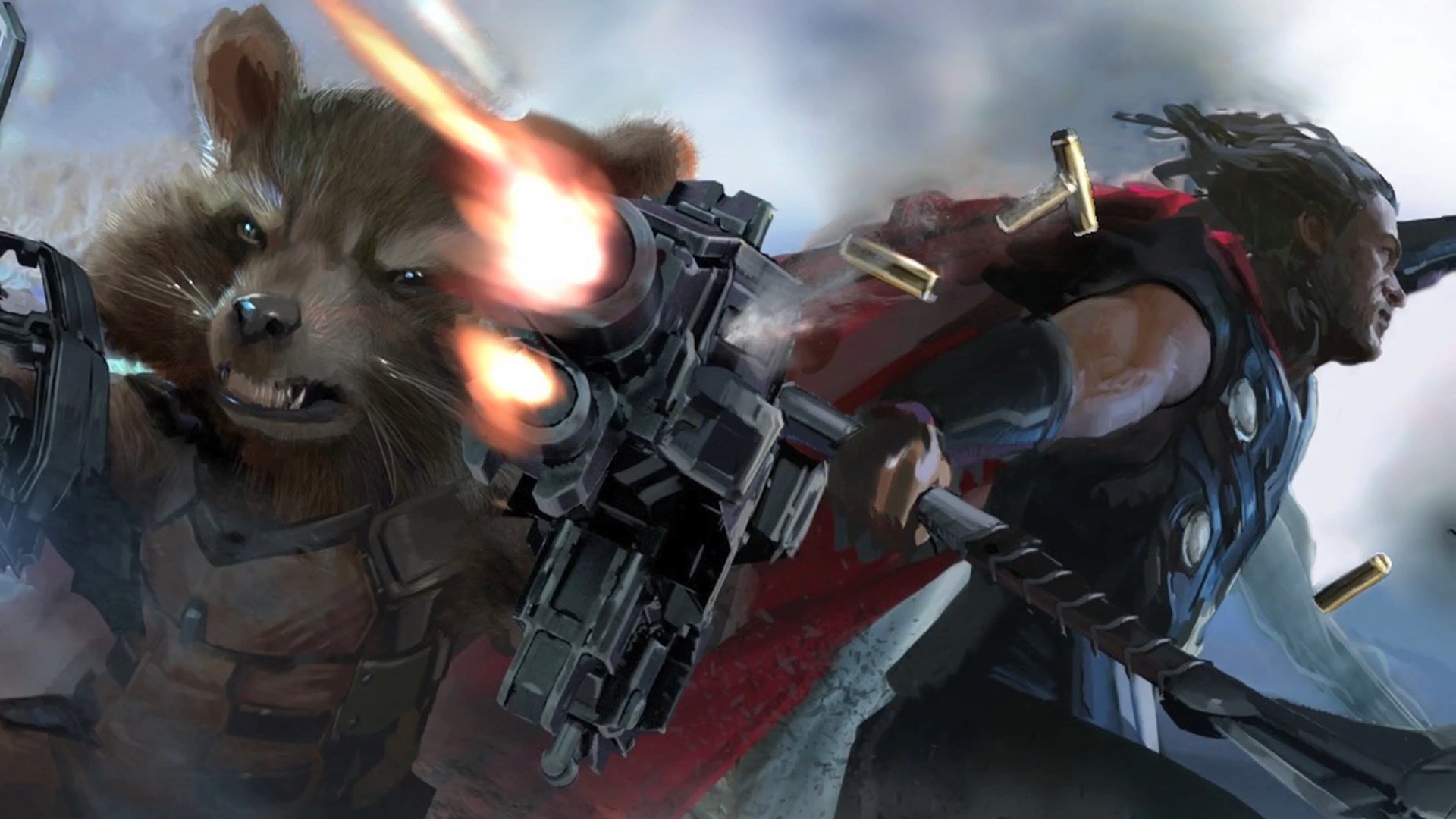 Et boum, c’est là, qu’on découvre le clou de cette featurette : le concept-art de Rocket Raccoon avec Thor en arrière-plan. Si vous avez l’œil d’Heimdall, vous remarquerez que Thor n’a pas Mjolnir, mais une hache. Ça ne sent pas bon pour Mjolnir dans Thor: Ragnarok. En tout cas, cette arme n’est pas sans rappeler Jarnbjorn, l’arme que Thor brandit souvent quand il n’a pas Mjolnir.