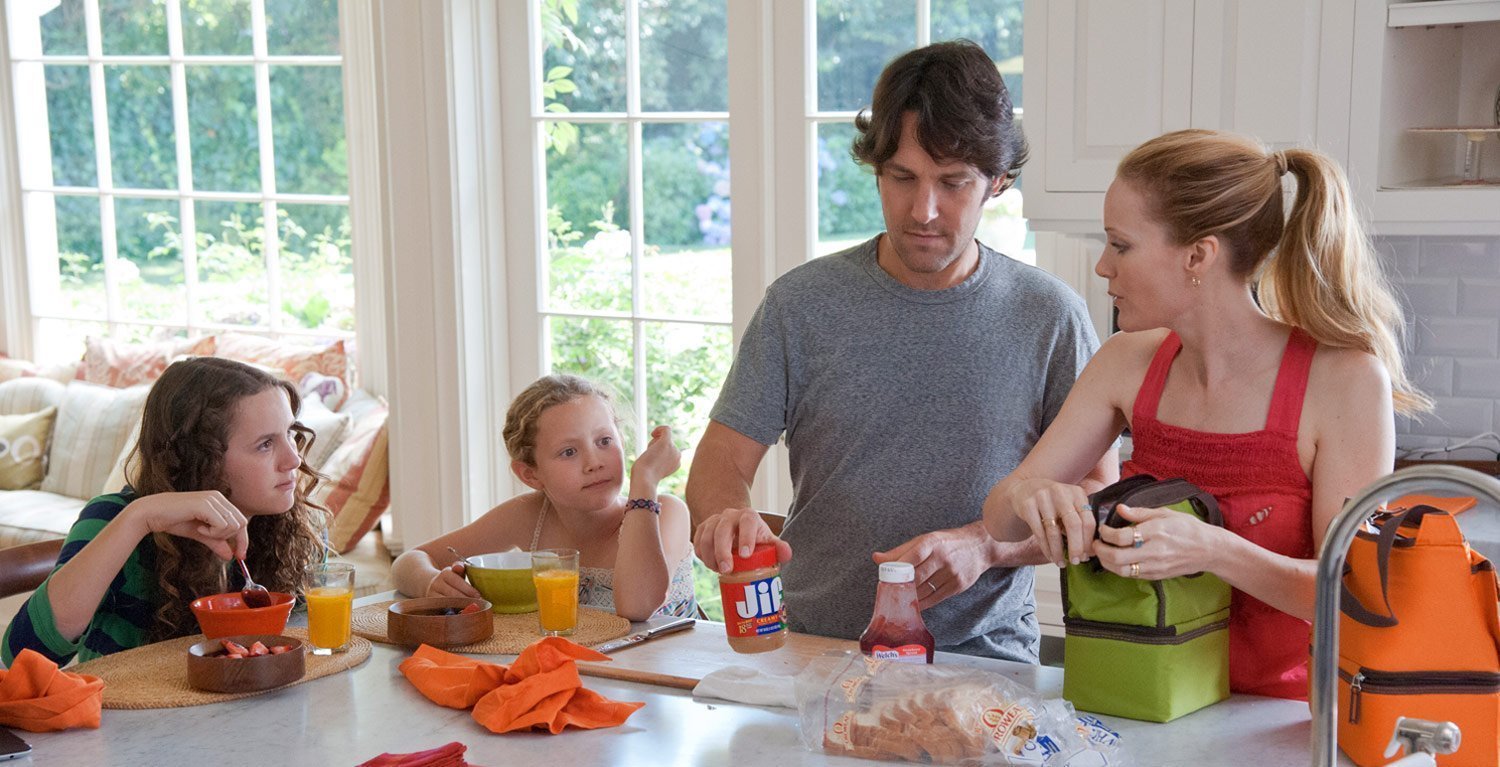 Pour 40 ans : mode d’emploi, on peut le considérer comme la suite d’En cloque : mode d’emploi (attention Bébé mode d’emploi n’a rien à voir avec l’univers Apatow malgré la même actrice principale) à l’exception près que ce n’est pas les mêmes personnages principaux. Seth Rogen et Katherine Heigl n’apparaissent même pas dans cette suite. Les héros sont les seconds rôles Pete (Paul Rudd) et sa femme Debbie (Leslie Mann, aussi femme d’Apatow dans la vraie vie), sœur de Katherine Heigl dans En cloque, mode d’emploi. Leurs gosses sont toujours incarnés par les vraies enfants du couple Apatow/Mann à savoir Maude et Iris Apatow. Du coup, c’est avec beaucoup de plaisir qu’on suit la crise de la quarantaine de ce couple et qui pour une fois n’implique pas d’infidélité.