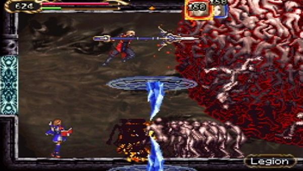 En terme de gameplay, on ne change pas une équipe qui gagne. Le jeu reprend tout ce qui a fait la réussite des Castlevania sur console portable avec la possibilité pour nos héros d’avoir différentes armes. Ainsi, Jonathan pourra utiliser le fouet, l’épée, la lance, les poings américains et j’en passe, tandis que Charlotte, elle, pourra utiliser les grimoires et la magie. Un choix assez varié qui permettra à chaque joueur de choisir son arme de prédilection. Ce que j’ai trouvé de sympathique dans ce jeu est la possibilité d’appeler à l’aide son compagnon afin de combattre les forces du Mal. Ainsi, Charlotte ou Jonathan, selon le personnage que vous jouez, pourra vous rejoindre pour affronter monstres et Boss pullulant les lieux. Mais outre cet aspect dans le combat, votre camarade sera utile durant l’exploration. Certains lieux ne pourront être débloqués qu’avec son aide (comme pousser un gros bloc de pierre par exemple). Par ailleurs, à force d’affronter de vilaines créatures, nos héros gagneront expérience et maîtrise en armes afin d’être au mieux de leur forme pour continuer la suite de leurs aventures.
