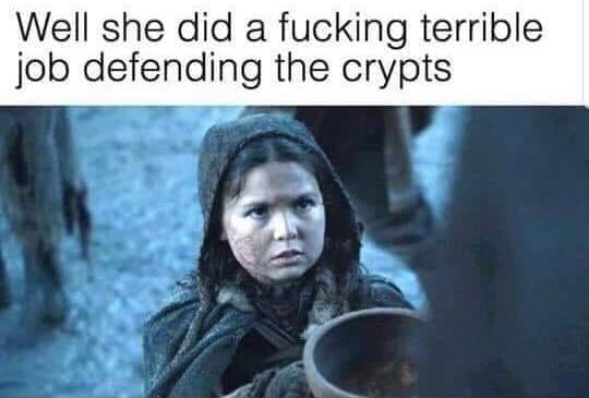 Pire, personne n’a pensé au fait que dans une crypte, ben, il y a des morts ? Mais bordel, pendant des saisons, vous étiez là à nous dire de faire attention aux morts et qu’est-ce que vous faites ? Vous rassemblez vos familles dans une… CRYPTE ! C’était tellement ridicule. Perso, je pensais sincèrement qu’ils avaient pensé à enlever les morts avant de s’en servir comme refuge. En plus, ce passage ne sert à rien car seuls des figurants y meurent.