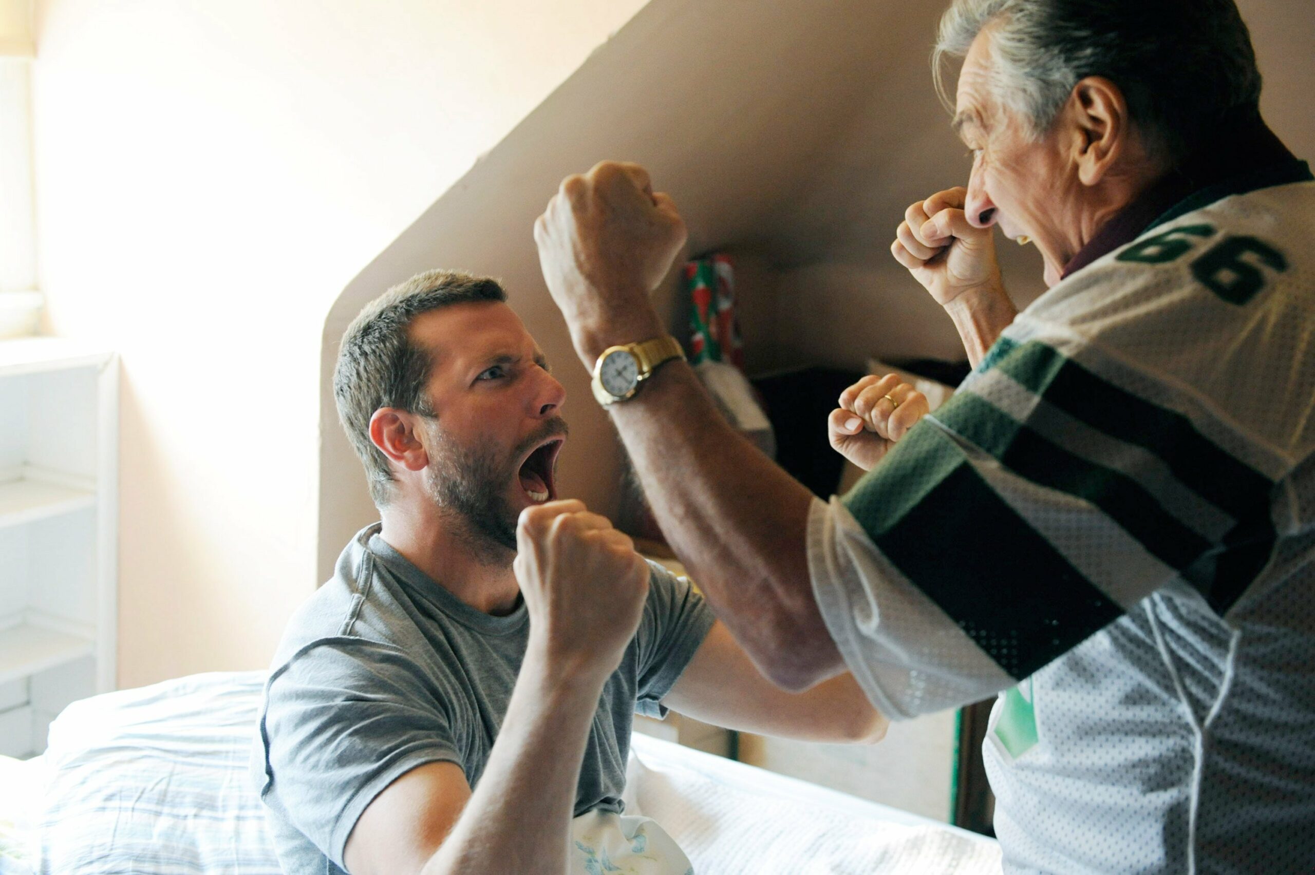 Toutefois, s’arrêter à ça serait réducteur car le scénario et le casting participe aussi à la magie du film. Certes l’histoire est d’un classique (deux êtres se rencontrent et se tournent autour) mais ses personnages principaux le sont beaucoup moins. Bradley Cooper est tout simplement génial et attachant en bipolaire obsédé par sa femme et traumatisé par un événement au point de finir à l’HP. Le personnage de Jennifer Lawrence est aussi traumatisé pour d’autres raisons. Leurs échanges sont assez atypiques car les deux sont d’une franchise absolue (surtout du côté de Bradley Cooper) donnant naissance à des répliques souvent très drôles (le fameux « Comment Tommy est mort? »). En plus de ça, on peut compter sur un Robert de Niro fendard en bookmaker superstitieux et sur une Jacki Weaver capable de te foutre des larmes aux yeux en une fraction de secondes (une très grande actrice).