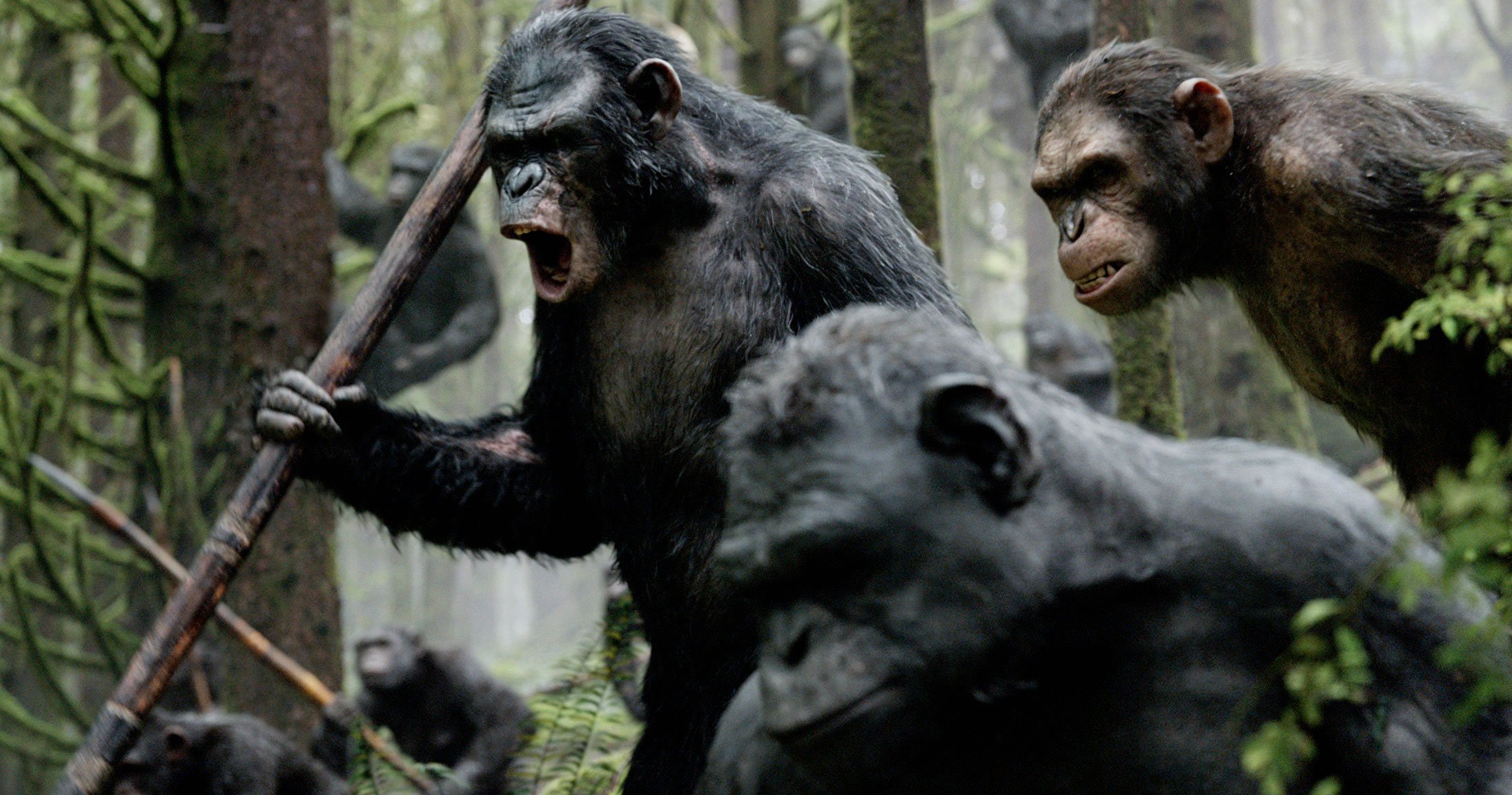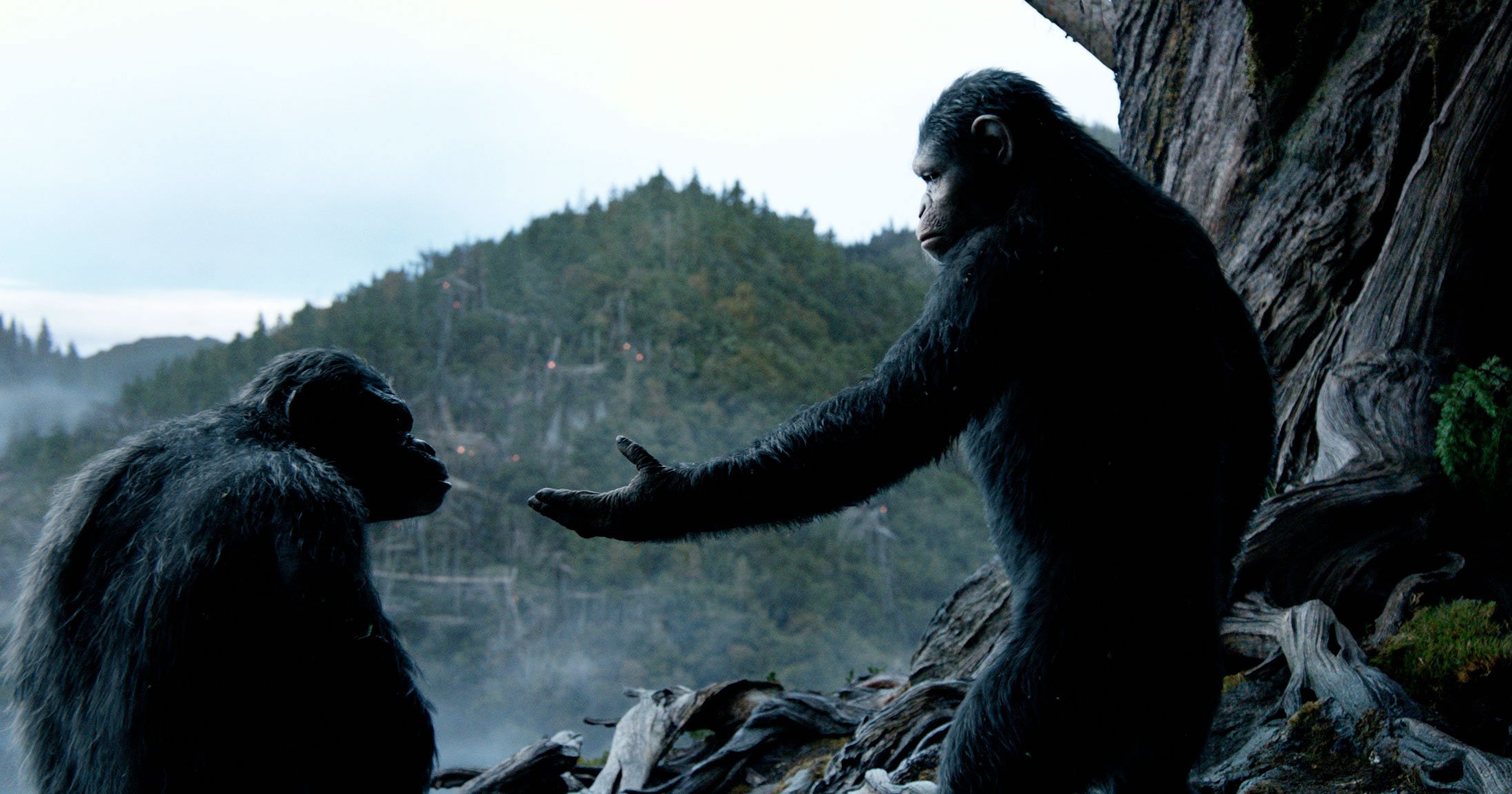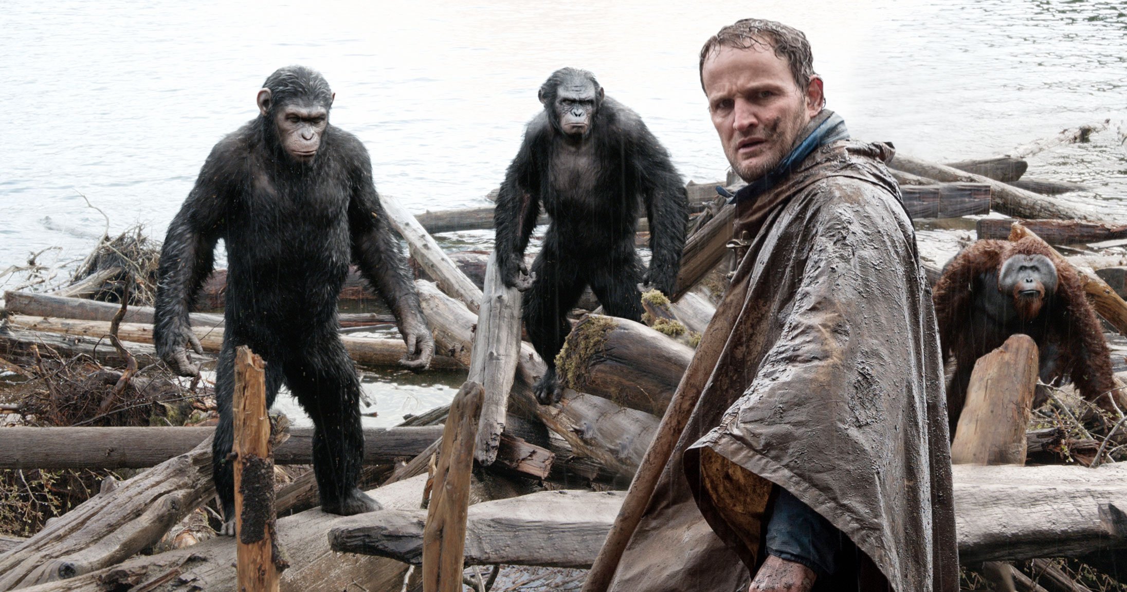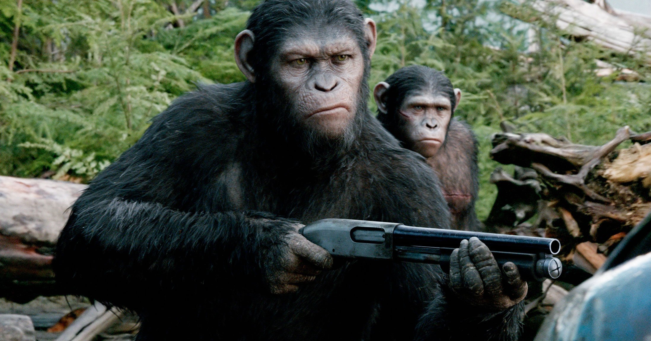 La Planète des Singes : L’Affrontement offre une véritable évolution par rapport au premier épisode où, pour rappel, le singe César était motion-capturé par Andy Serkis (Gollum, King Kong). Il faut dire qu’on quitte la tranquillité des studios pour un tournage en pleine nature, dans les impressionnantes forêts de Vancouver. Si la technologie a fait un joli bond, il aurait néanmoins fallu offrir une scène d’ouverture de meilleur acabit. L’Affrontement s’ouvre avec une gigantesque chasse. Seulement, la modélisation des chassés, des cerfs, est absolument dégueulasse. Personnellement, j’ai décroché du film à ce moment-là, et j’ai mis un bout de temps avant de réussir à me reconnecter.