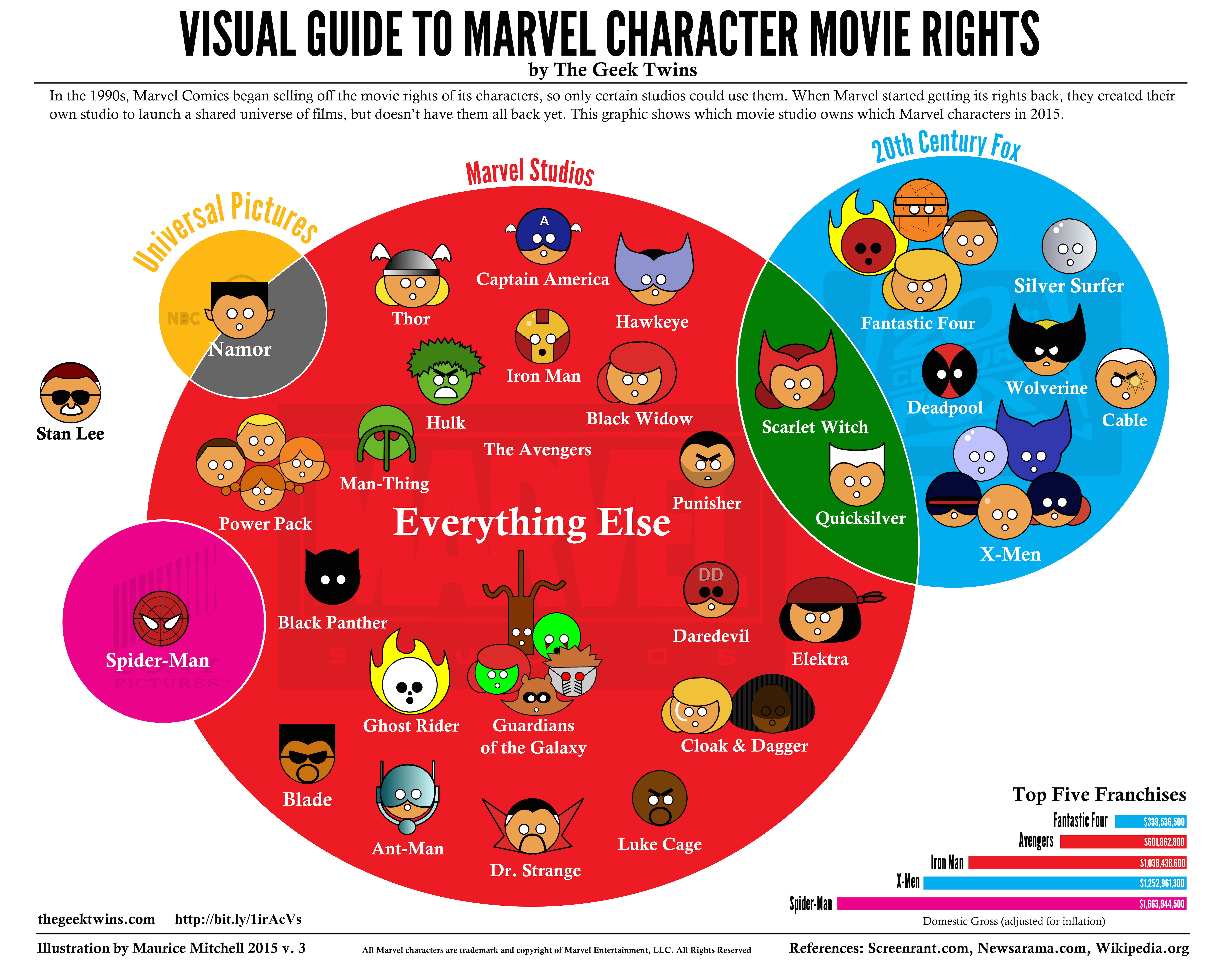 Avant d’examiner cette infographie, il faut savoir qu’au début des années 2000, Marvel, alors presque en faillite, vendait (le terme exact serait plutôt « louait ») les droits de ses personnages à des studios de cinéma pour qu’ils puissent faire des films sur ces personnages. C’est ainsi que sont nés les X-Men (20th Century Fox) et Spider-Man (Sony Pictures).