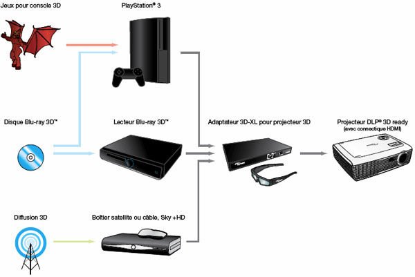 Il est question d’un boîtier 3D-XL pour vidéoprojecteur DLP Link qui sera disponible janvier 2011 pour 300 euros. Ce boîtier permettra à partir d’un lecteur bluray ou de la PS3 d’afficher de la 3D avec un vidéoprojecteur DLP.