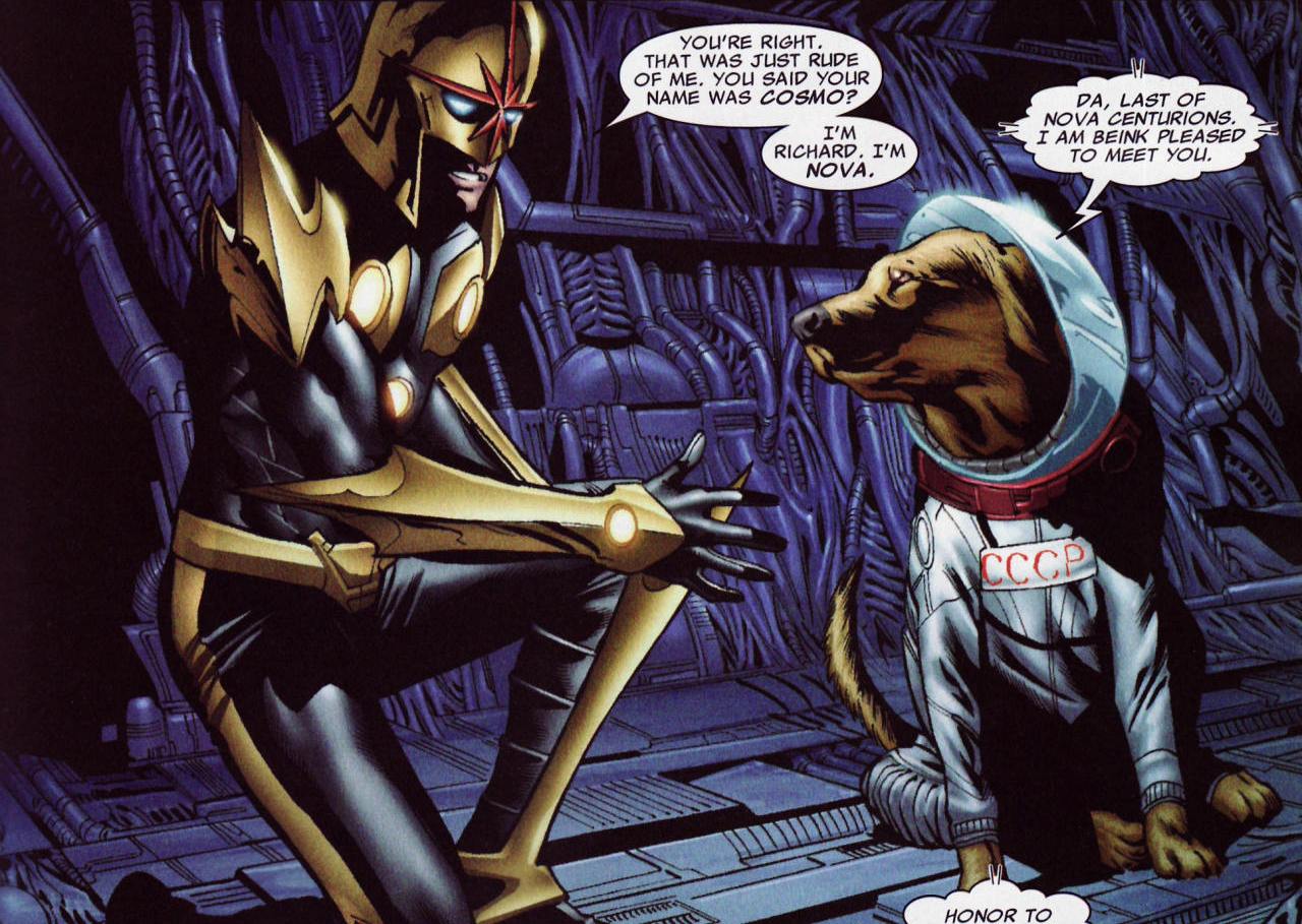 Dans le comic, Cosmo est le chef de la sécurité de Knowhere. Mais comment peut-il protéger une tête aussi vaste ? Ce n’est qu’un chien. Tout simplement grâce à ses pouvoirs télépathiques lui permettant de communiquer (vu qu’il ne peut qu’aboyer) et de combattre (Professeur X n’a plus qu’à bien se tenir). Il aide très souvent les Gardiens de la Galaxie dans leurs missions et on peut même le considérer comme un membre à part.