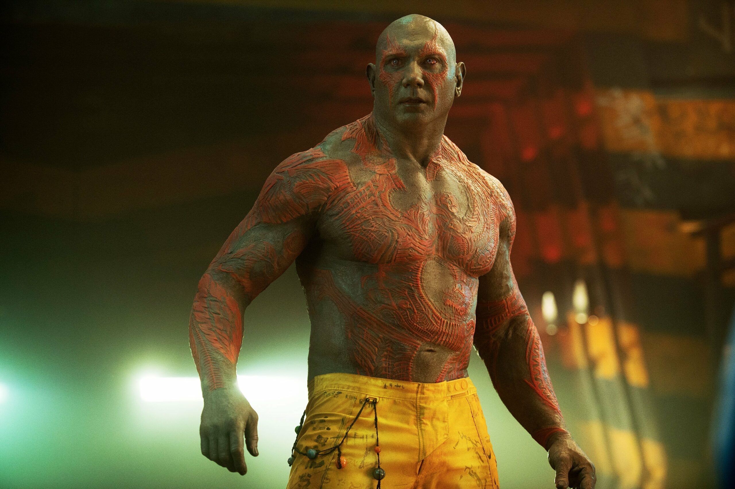 - Drax le Destructeur est interprété par Dave Bautista, ancien champion de catch de la WWE. Les tatouages et scarifications sur le corps du personnage illustrent son parcours et ce qu’il a vécu dans sa vie. Il fallait quatre heures de travail par jour à une équipe de cinq maquilleurs pour appliquer les 18 pièces différentes du maquillage prosthétique sur le corps et le visage de l’acteur. Et il fallait que celui-ci reste debout pendant tout ce temps ! À la fin du tournage, Dave Bautista totalisait sept journées complètes passées entièrement maquillé !