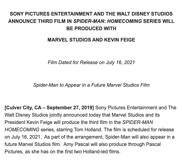 Plus curieux est la phrase suivante du communiqué « seul héros doté du super pouvoir de traverser les univers cinématographiques ». Faut-il comprendre qu’il fera également parti de l’univers de Sony ? À moins que Sony ne mette en place le Spider-Verse des comics donnant à Tom Holland la possibilité de naviguer entre les deux univers. Du coup, un film sur Madame Web, ça a du sens.